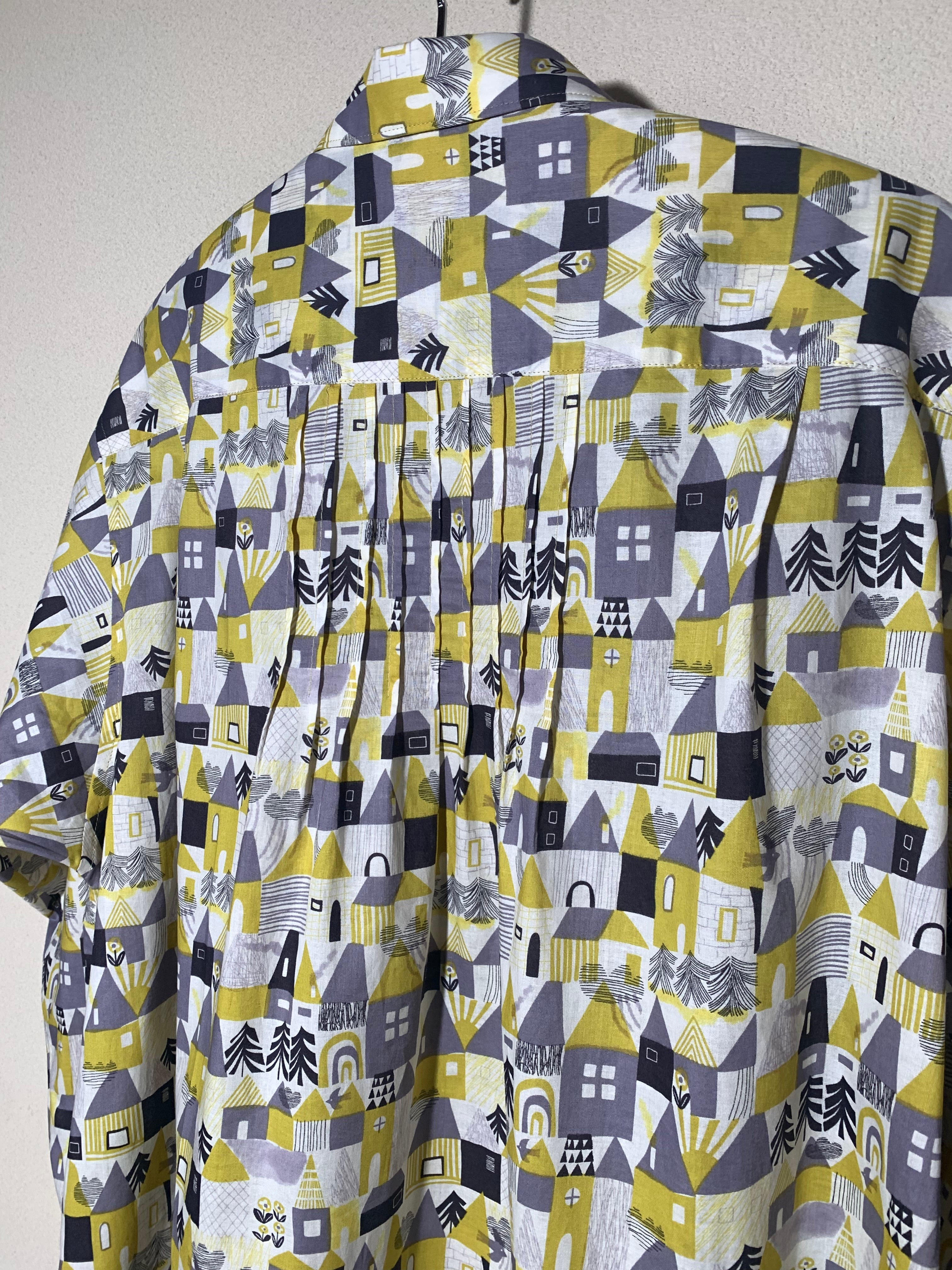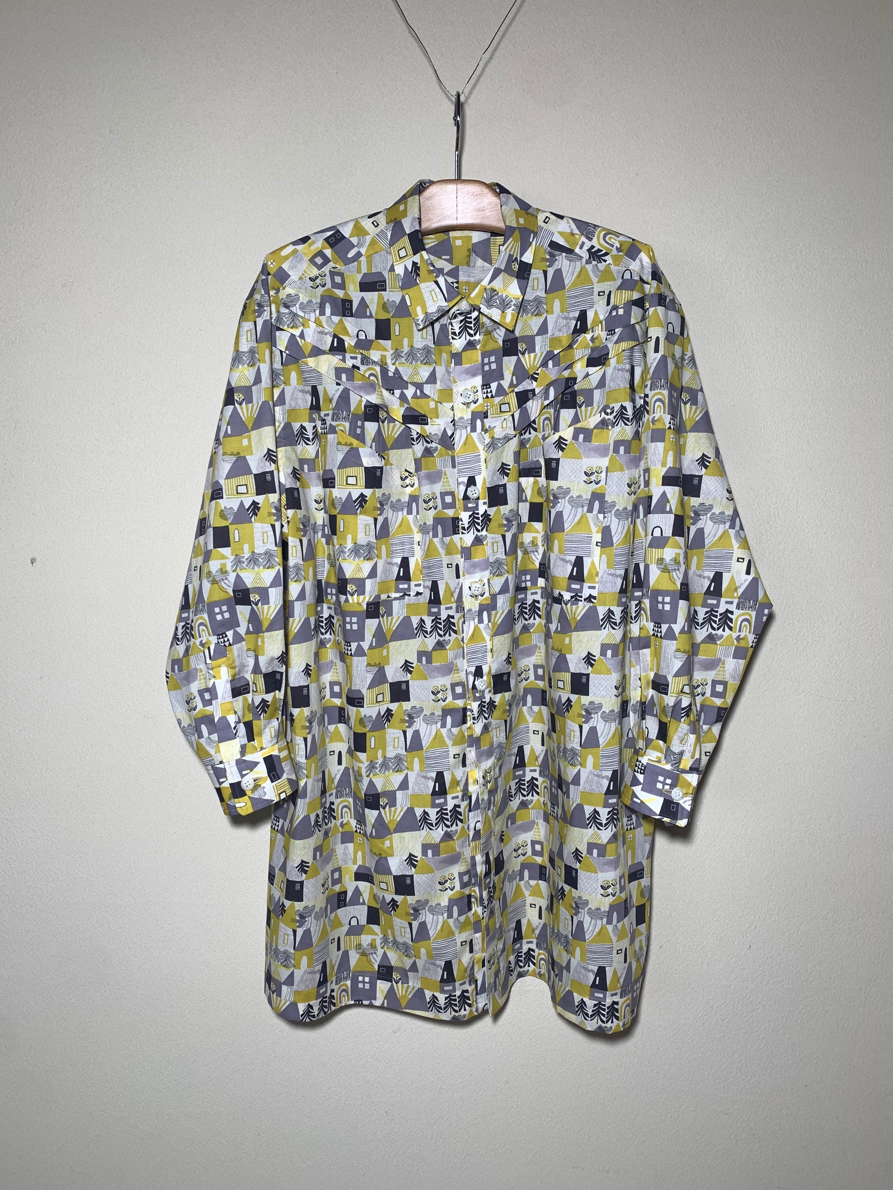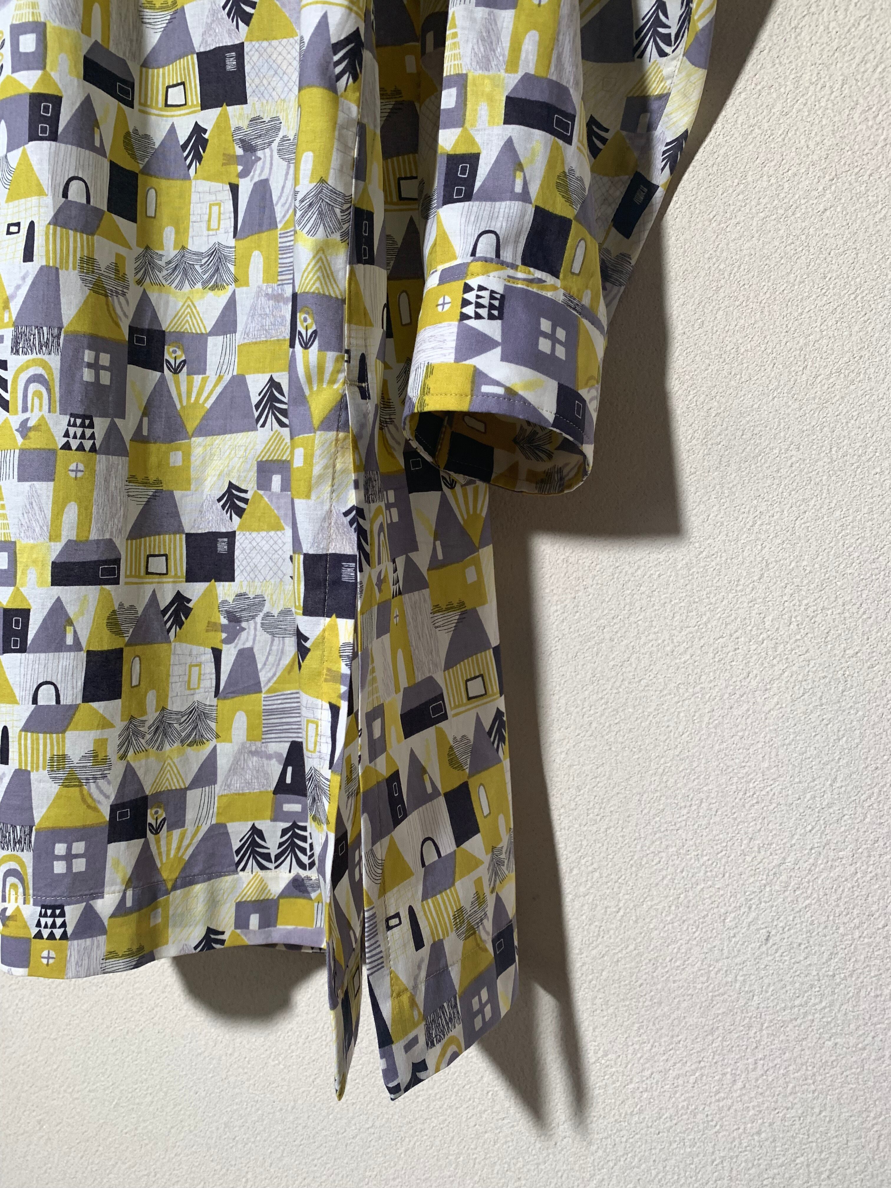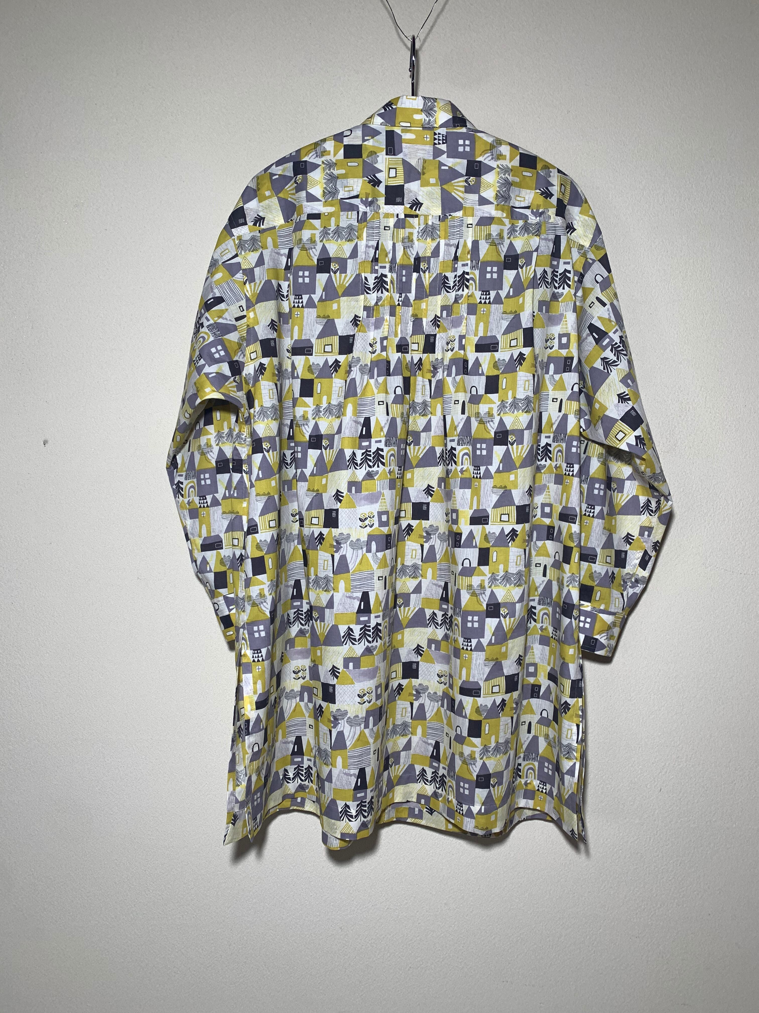 少し透け感のある薄手綿素材のプリントを使用した軽いロングシャツです。 山吹色のとんがった屋根の家が並んだとても愛らしいプリントです。 胸には斜めタックをたたみ、同じ斜傾のパッチポケットが付いています。 後身頃は5mm幅のタックで身幅にゆとりを持たせています。 両脇24cmの裾スリット入り。 着丈 81cm / 身幅 64cm / 裄丈 75cm ( カフス5.5cm )