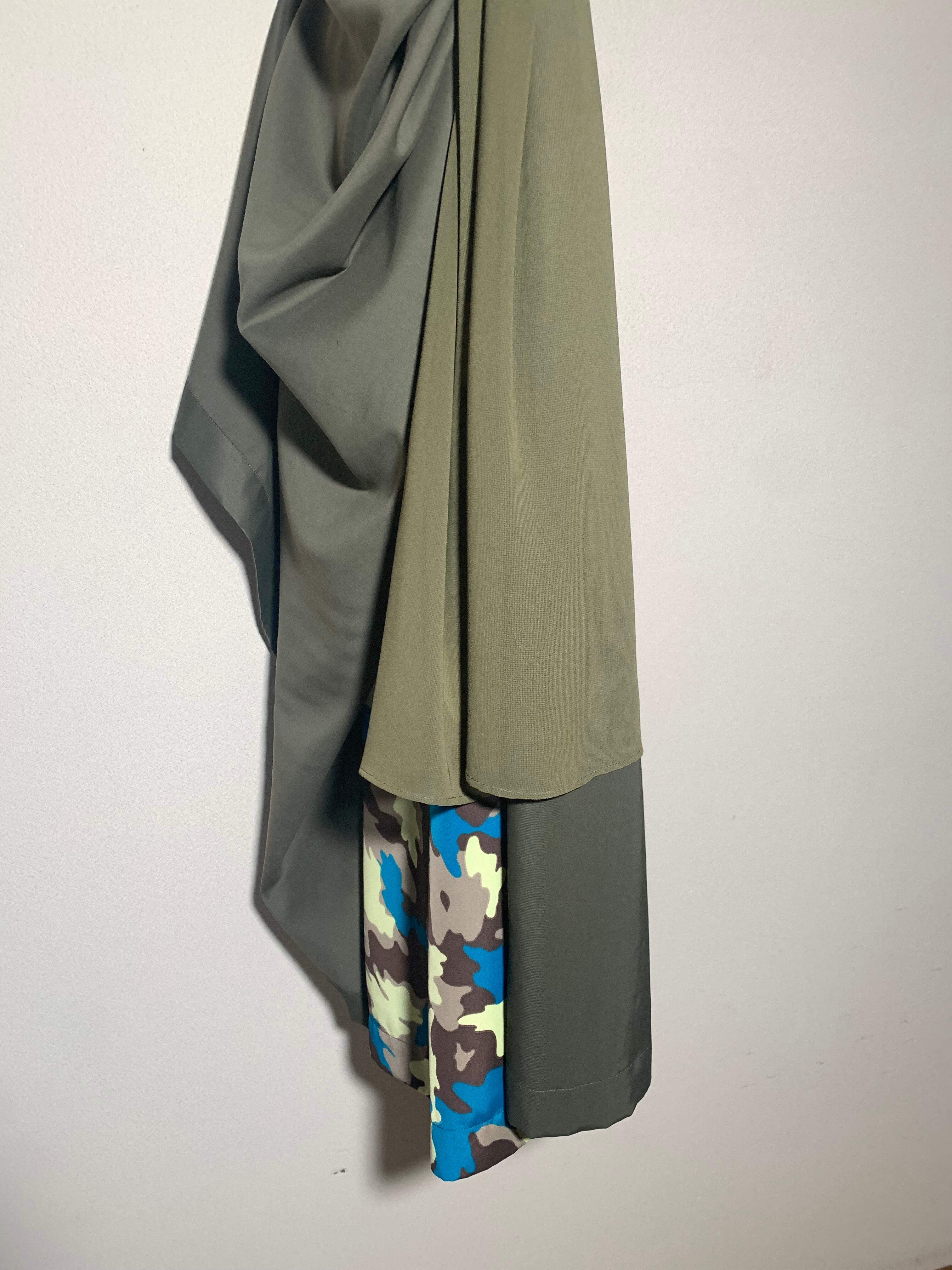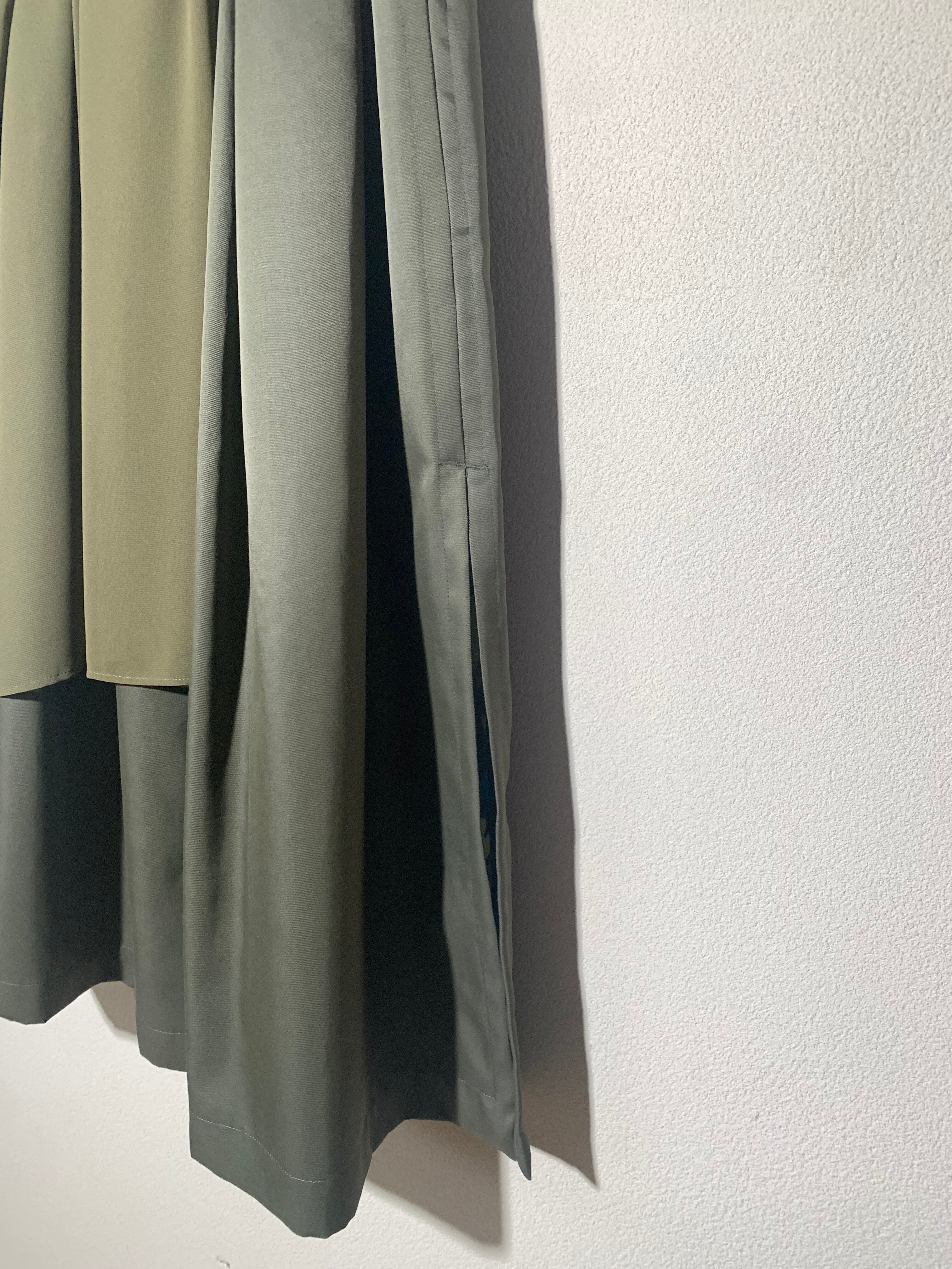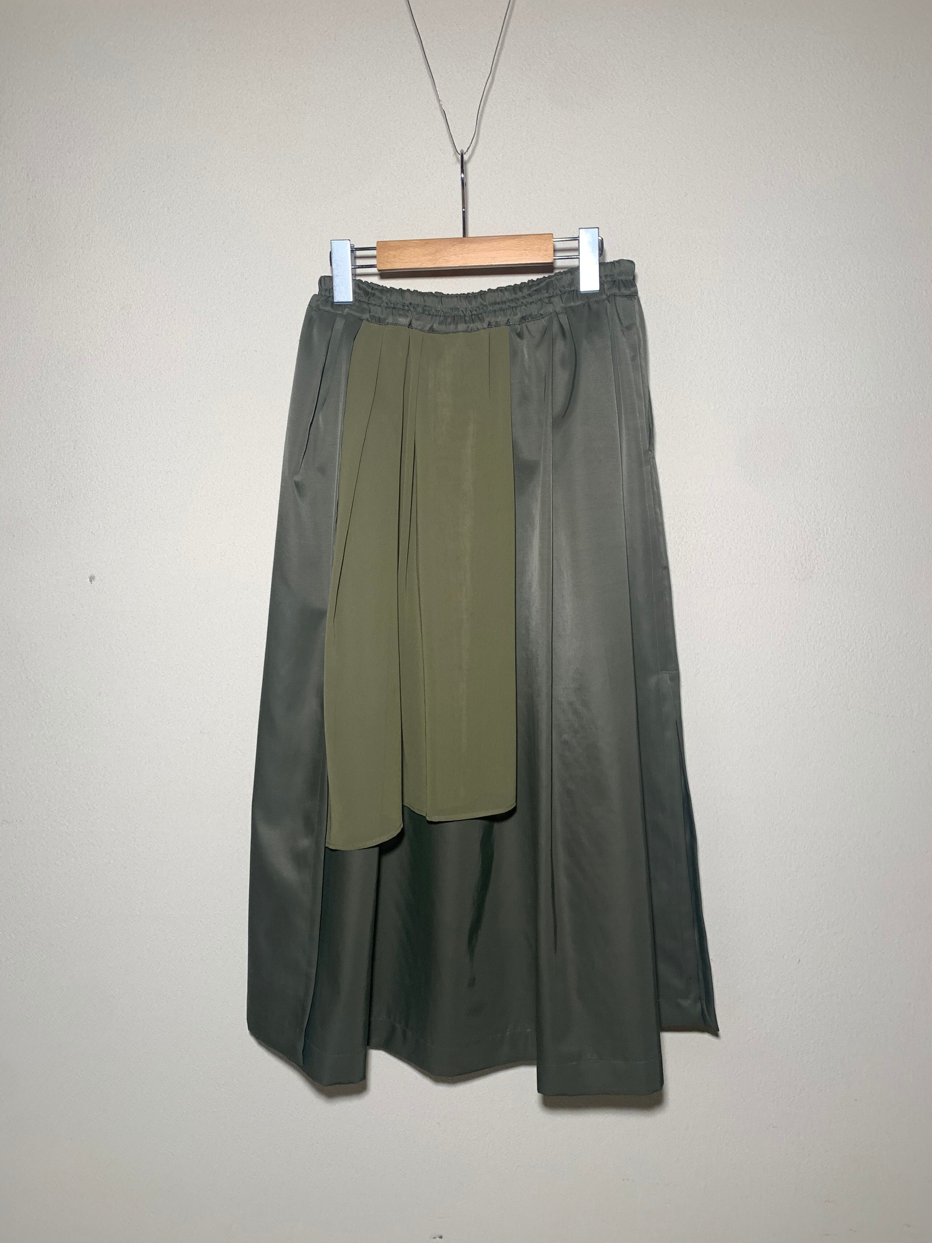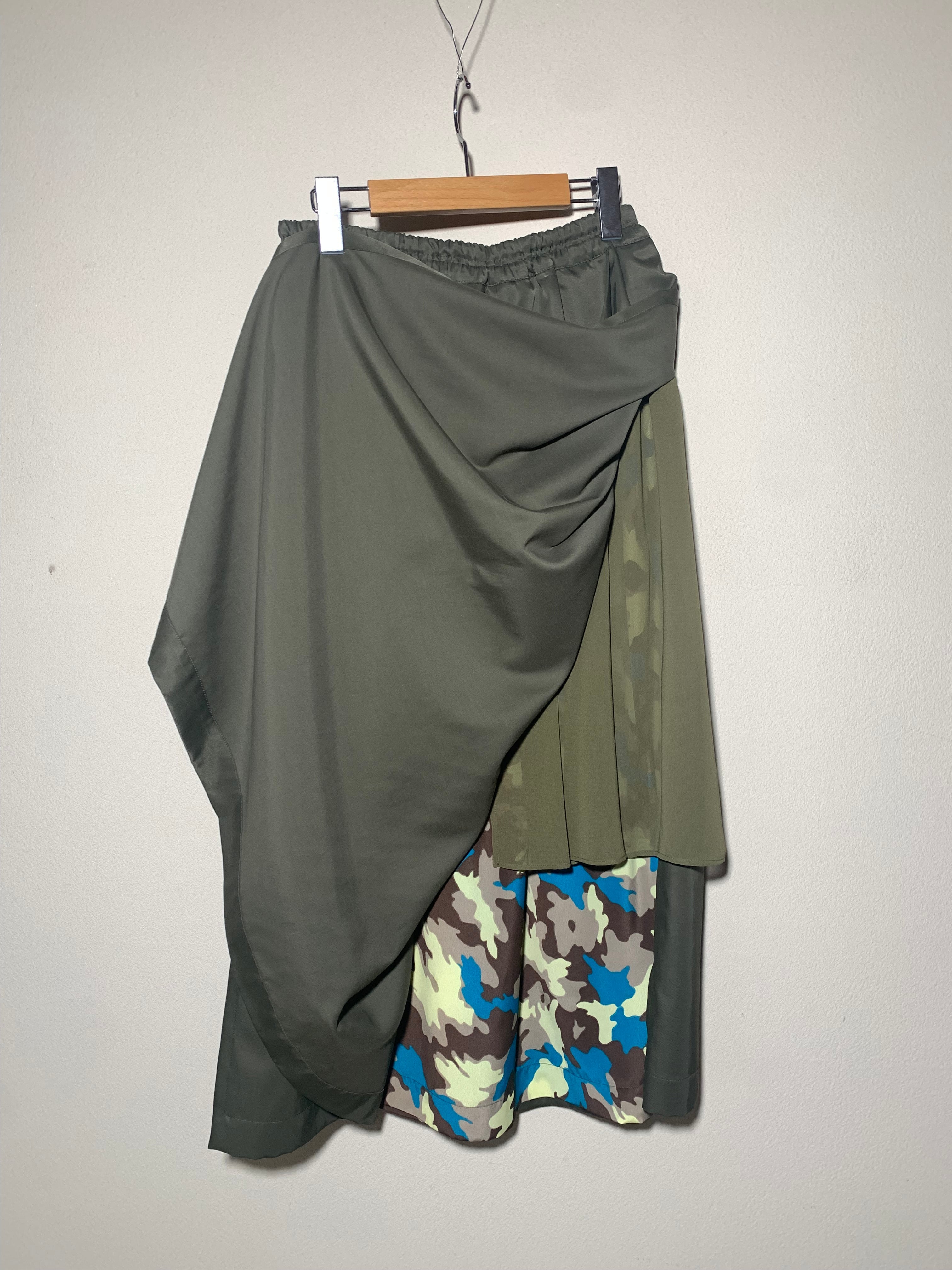 前スカートはポリエステルカーキ素材、後ろスカートはポリエステルカーキ素材と透け感のあるポリエステルカーキ素材を重ねて、内側の前スカートはカーキ、ブルー、ココアブラウン、クリーム色のカモフラージュ柄のポリエステル素材を使用して、巻きスカート風にしています。両サイドはスリットが入っています。 ウエストはゴム仕様で固定しています。 右前のみスラントポケット付き。 ウエスト 67cm〜/ スカート丈 ベルト下から79.5cm